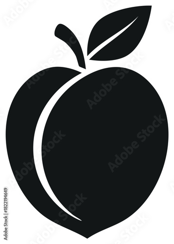 Simple black peach icon with stem and leaf stylized vector silhouette