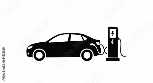 Simple black silhouette icon of an electric car plugged into a charging station with a lightning bolt symbol.
