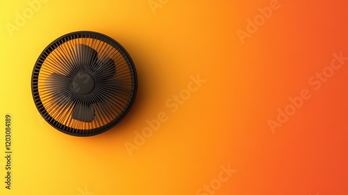 Simple, modern wall fan with a circular frame, against a warm-toned backdrop of orange and yellow