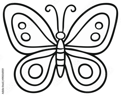 Simple outline drawing of a butterfly with bold black lines and circular wing patterns
