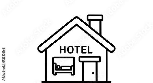 Simple outline illustration of a hotel building with a bed visible inside