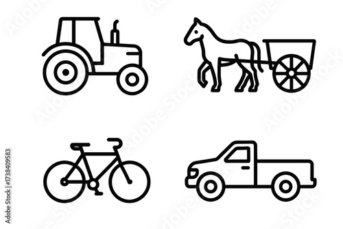 Simple outline illustrations of transportation: tractor, horse cart, bicycle, pickup truck