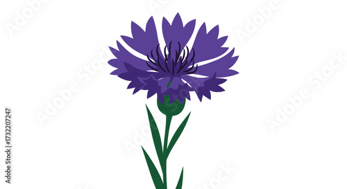 Simple purple cornflower with green stem on a white background