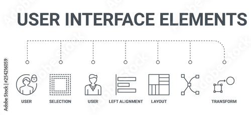 simple set of 7 line icons such as transform, , layout, left alignment, user, selection, user from user interface elements concept on white background