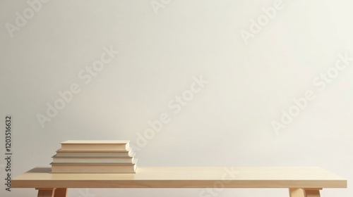 Simple Stack of Books on a Light Wooden Table Against a Blank Wall