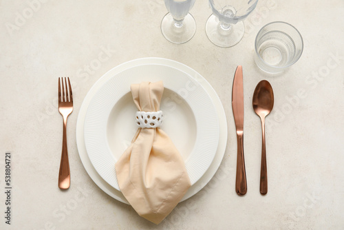 Simple table setting with cutlery, glasses and napkin in plate on light background