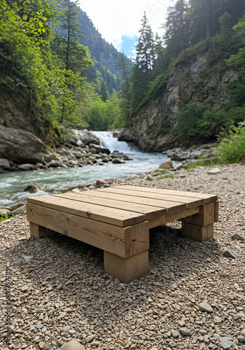 Simple wooden bench by a river in mountains