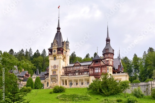 Sinaia, Romania - August 2019. Great Pelesh castle and park in Sinaia, Romania. Romania King Carol Palace and park with medieval beautiful buildings