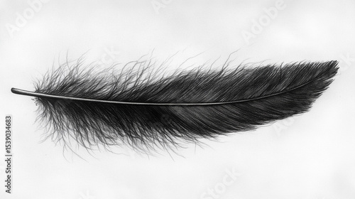 Single black feather on white background, detailed drawing