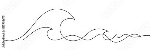 Single continuous line drawing surf ocean waves isolated on white background, also logo idea. Water splashes wave twirl isolated surge sparks breaker. One line draw graphic design vector illustration.
