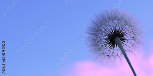 Single dandelion seed head close-up with soft blue and pink sky background. Delicate natural silhouette for conceptual or dreamy visuals.