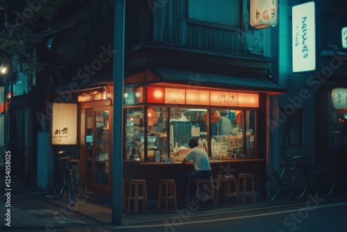 Single diner in a warmly lit restaurant at night, capturing the essence of solitude and quiet reflection.