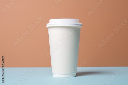Single disposable coffee cup on a pastel blue and orange background, space for logo.