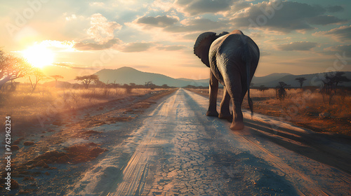Single elephant walking in a road with the Sun from behind