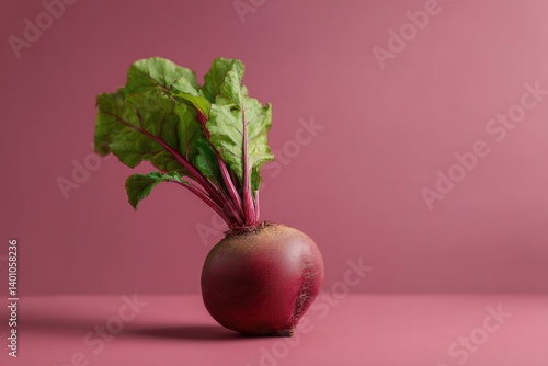 single fresh organic beet with vibrant green leaves on smooth solid color background in minimalistic style