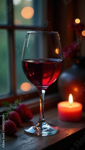Single glass of red wine, flickering candle flames nearby , night, close up, detail