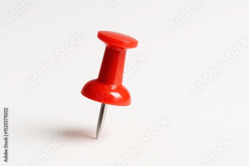 Single, glossy red push pin or thumbtack, sharply focused and casting a subtle shadow, isolated on a pristine white background, symbolizing marking, planning, or a reminder.