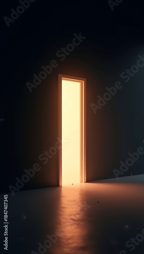 Single glowing doorway floating in dark space, light spilling outward symbolizing opportunity and new beginnings, minimalistic surreal concept, cinematic lighting