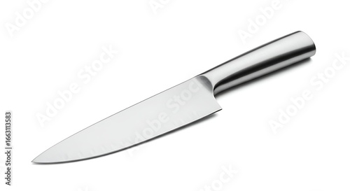 Single isolated stainless steel kitchen knife on plain white surface studio shot.