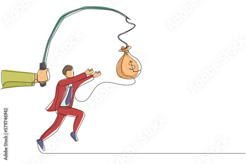 Single one line drawing hand with fishing pole and money bag control greedy businessman under hypnosis. Man running after dangling money bag and trying to catch it. Continuous line draw design vector