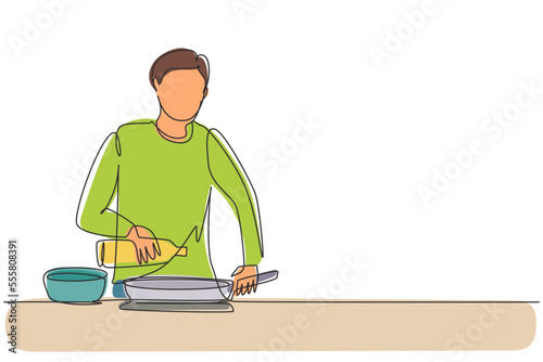 Single one line drawing happy husband pouring cooking oil from bottle into frying pan on stove. Prepare food at cozy kitchen. Cooking at home. Continuous line draw design graphic vector illustration