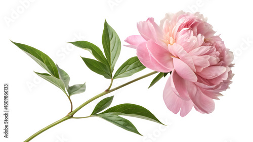 Single pink peony flower with green leaves and stem on transparent background
