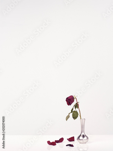 Single red rose in vase on white background