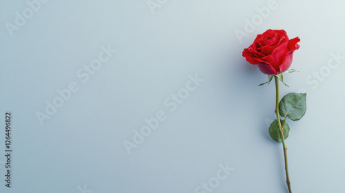 single red rose on light blue background, symbolizing love and beauty