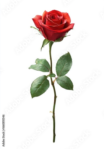 Single red rose with green leaves on a white background