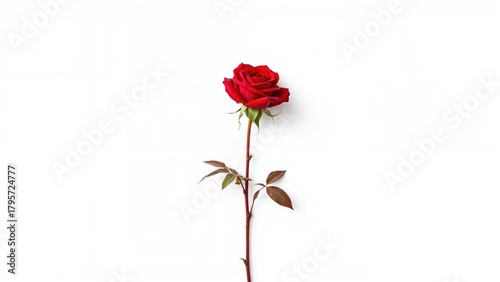 Single red rose with green leaves on a white background.