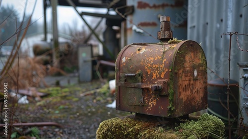 Single rusted mailbox with moss, standing next to an old propane holding, surrounded by an abandoned town