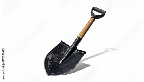 Single used shovel with black metal blade, wooden handle, black D-grip, casting shadow on white background.