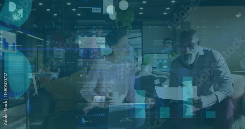 Sitting colleagues reviewing charts on sofa in office lounge, with coffee cups and data overlay