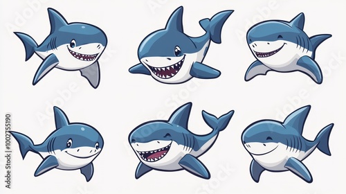 Six cartoon sharks with different expressions isolated on white.