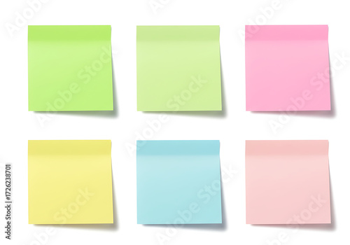Six colorful sticky notes arranged in two rows, casting soft shadows on a white background.