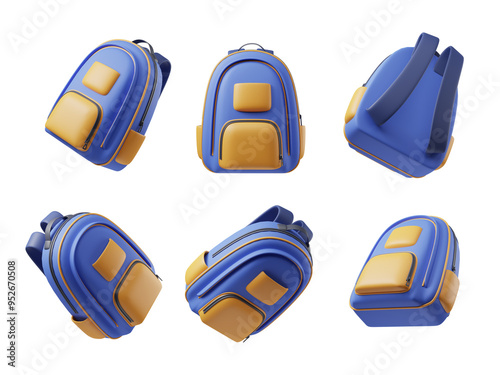 Six different views of a blue and yellow backpack. Various angles and perspectives. On a white background. Concept of backpack design. 3D Rendering