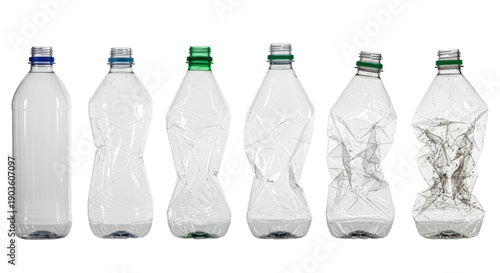 Six empty plastic bottles (PET, HDPE) from new to crumpled waste on a white cyclorama, contrasting pristine to damaged textures, metallic blue to broken green caps. Plastic pollution concept