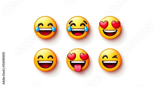 Six yellow emoji faces with different expressions arranged on a white background surface view