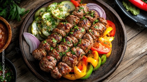 Sizzling Adana kebab served with colorful vegetables on a rustic wooden table showcasing traditional Turkish cuisine