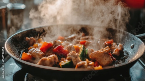 Sizzling Chicken and Vegetables in Frying Pan