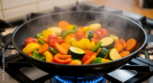 Sizzling Fresh Vegetables Cooking in a Hot Pan on a Gas Stove