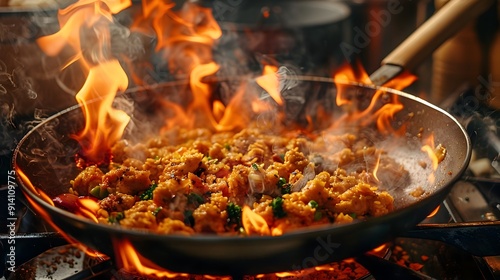 Sizzling Meal in a Frying Pan with Intense Flames and Cinematic Lighting in a Rustic Country Kitchen