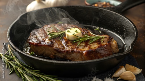 Sizzling Rosemary Steak with Melted Butter in Cast Iron Skillet