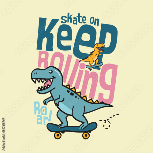 Skateboarding Dinosaurs Keep Rolling Roar! Cartoon Print