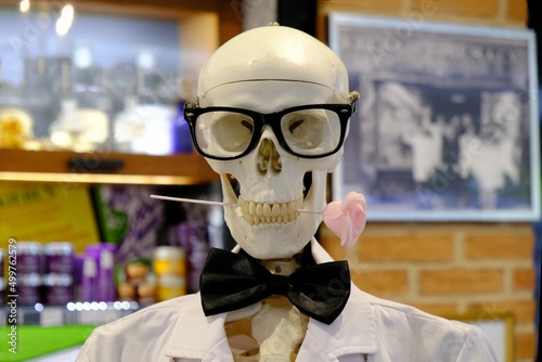 Skeleton with glasses in a white coat with a rose in his teeth. In the background, shelves with cosmetics in boxes.