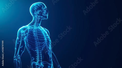 Skeleton anatomy of a male human body in glowing blue X-ray style, 3D medical illustration with copy space on blue gradient background