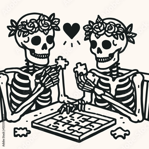 Skeleton couple wear flower crown doing a puzzle a minimalist vector graphic of a spooky yet sweet pastime.