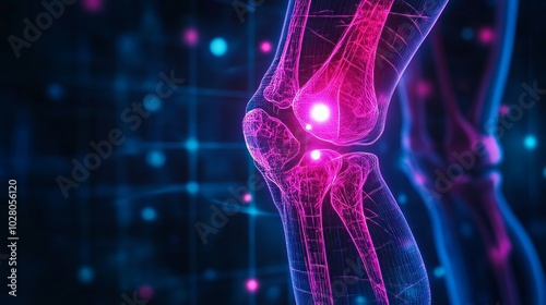 Skeleton knee with glowing holograms for joint pain analysis, osteoarthritis mapping, neon lights for futuristic joint healing tech, Futuristic, Sci-Fi Neon