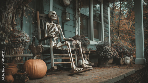 Skeleton sitting on a rocking chair by the porch , Hallowen, photo style