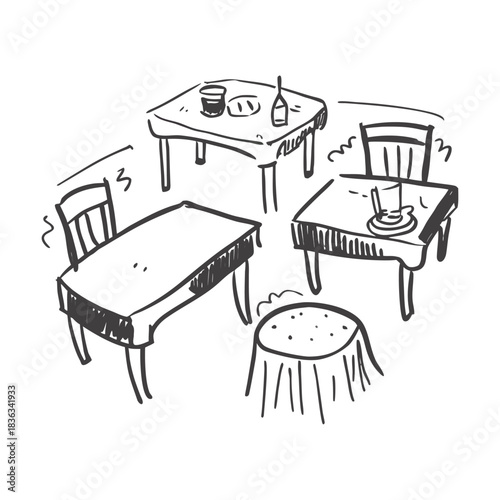 Sketch illustration of a vintage wooden table and chairs furniture in an empty cafe kitchen interior room
